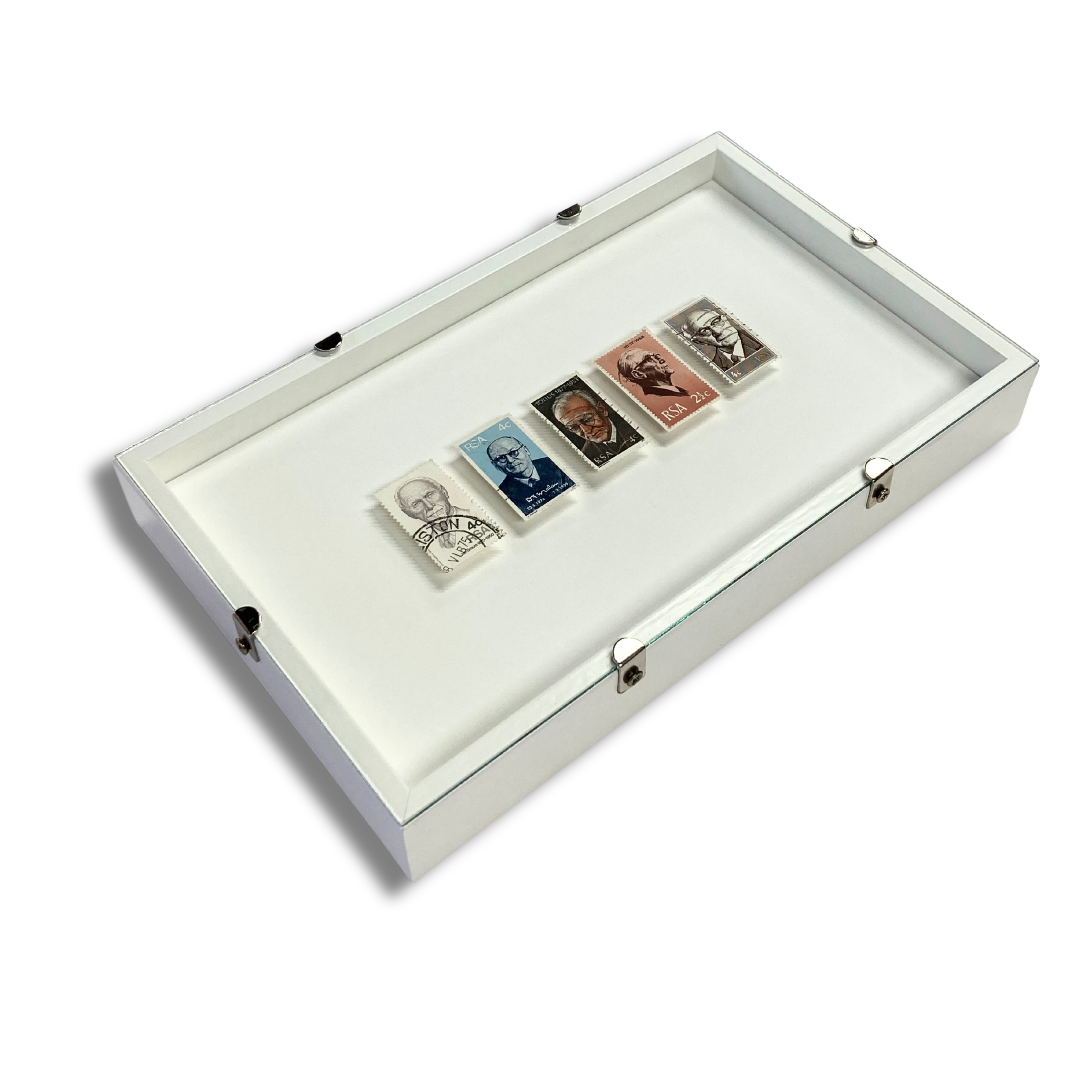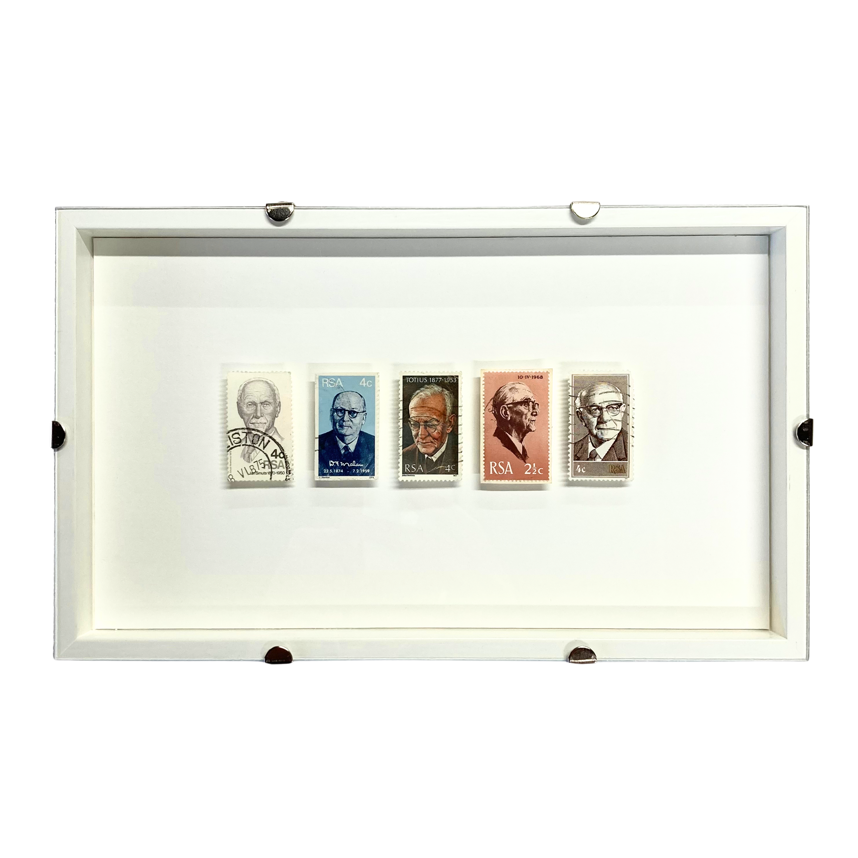 The frame contents are made up of a collection of vintage South African stamps which depict a variety of influential or prominent SA figures.